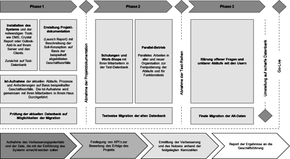 Um in der Einführung der Systeme einem koordinierten und für alle beteiligten transparenten Ablauf zu folgen, gehen wir nach der hier dargestelten Implementierungsstrategie vor: