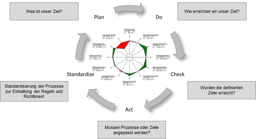 Diese Ziele überwachen wir mit einem eigens entwickelten Kennzahlen-System, dass die Basis für die Durchführung des kontinuierlichen Vebesserungsprozesses bildet.